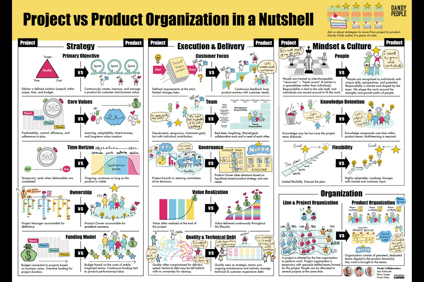 This nice infographic, prepared by Dandy People contrasts project and product organizations, highlighting their strategic objectives, governance, execution, and cultural differences. It’s quite easy and gives a bird’s eye view.
